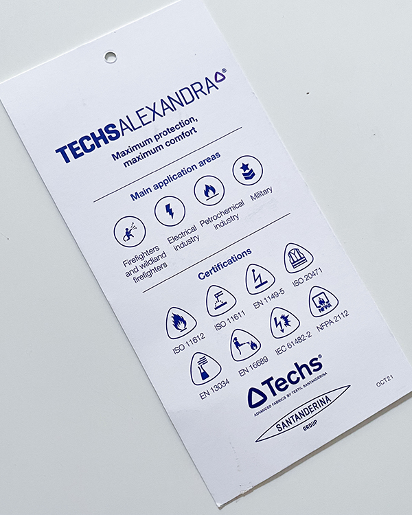 Carton label designed to be used on garments made of fabrics from the TechsAlexandra family. The label will highlight the value and importance of the brand.